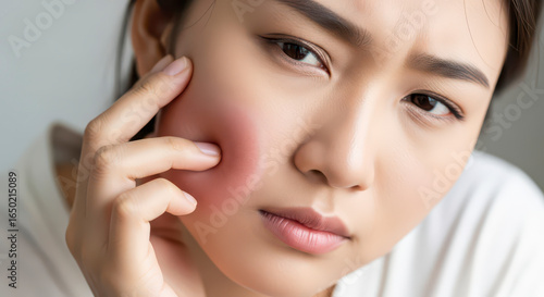 face, cheek, swollen, redness, pain, discomfort, inflammation, medicals, health, dermatology, acne, cyst, pimple, infection, allergy, rash, irritation, skin, problem, concern, symptom, unwell, distress, young, asian