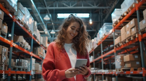 woman, business, technology, shipping, smiling, businesswoman, men at work, work, warehouse, happy, casual attire, tablet, inventory, young, curly, industrial, logistic, employee, device, indoor, management, box, shelf, cyberspace, storage, retail, stock, occupation, cargo, e-business, freight, distribution, facility, order, merchandise, fulfillment, merchandising, hand-held, stockroom