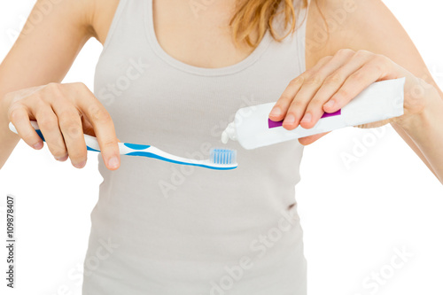 toothbrush, woman, teeth, oral, teeth, dental, toothpaste, health care, hygiene, care, medicine, brush, brushing, girl, health, tube, well-being, white, apply, applying, showing