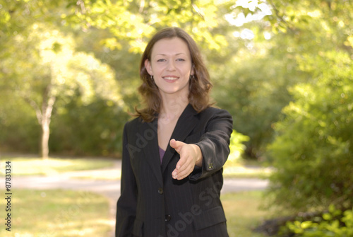 woman, smiling woman, greeting, handshake, meeting, park, business, missy, water bottle