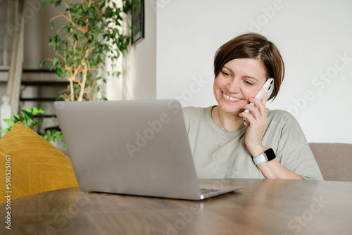 Woman work on laptop at the table. Portrait of smiling woman with computer