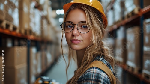 woman, wearing, looking, hard hat, goggles, men at work, standing, warehouse, industry, factory, indoor, employee, portrait, logistic, distribution, storage, occupation, professional, uniform, job, safety, protection, flannel, box, shelf, cardboard, shipping, delivery, inventory, stock, stack, organised, row, aisle, light, closeup, sharpened, commercial, concept, manual labor