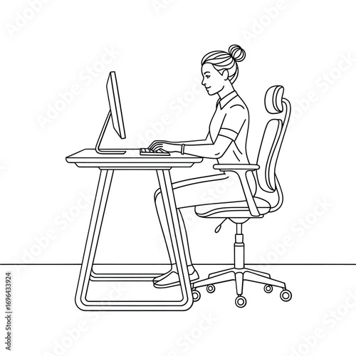 woman, computer, desk, office, work, typing, sitting, chair, screen, technology, business, illustration, drawing, vignetting, outline, line, art, modern, workspace, employee, professional, female, person, home, remote, online, digital, keyboard, monitor