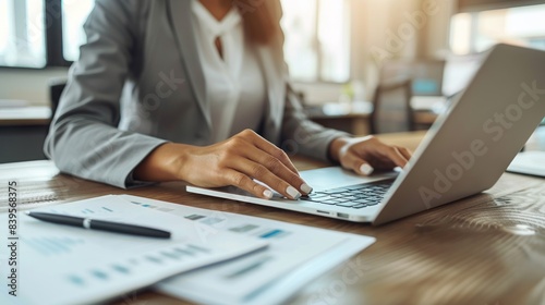 businesswoman, woman, working, laptop, computer, office, desk, paperwork, document, datum, analysis, research, business, professional, typing, keyboard, hand, finger, day, light, window, table, wooden, white, grey, suit, shirt, pen, paper, modern, technology, cyberspace, communication, productivity, sharpened, concentration, success, career, job, work, employee, businessperson, finance, marketing, sale, strategy