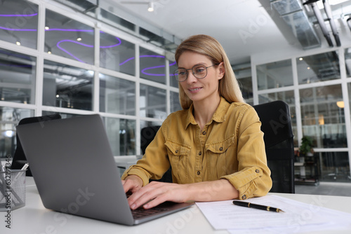 Woman working on laptop at white desk in office