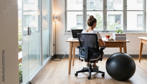 Woman working on laptop in a modern home office with gym ball