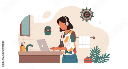 Woman working on laptop in bathroom, modern lifestyle illustration for blog, website or social media.