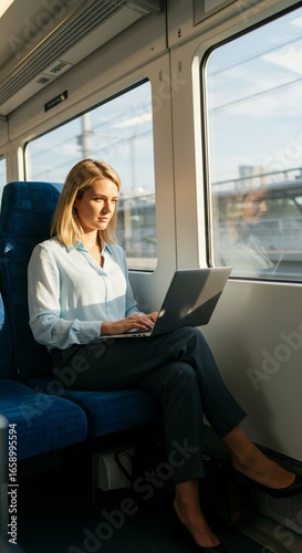 Woman working on Laptop inside Train: A focused professional woman engrossed in her work on a laptop, seated comfortably by a window inside a modern train, the soft natural light illuminating her.