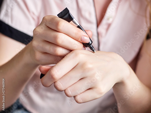 Woman's beauty blogger hands holding black tube spa professional hi-end cosmetics, applying sample trendy tone on her skin with blurred body background and copyspace