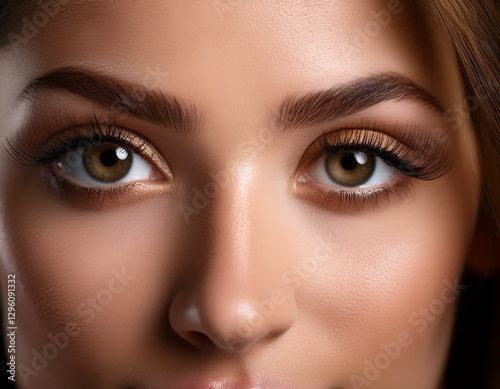 woman’s eyes, featuring bold eyeliner and dramatic lashes. The captivating look is enhanced by the subtle reflection of light in her eyes, drawing attention to their depth and intensity.