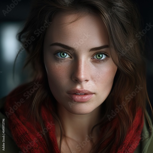 woman's face looking directly at the camera, green eyes, dark brown hair with red streaks taken