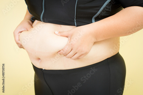 Woman's fingers measuring her belly fat