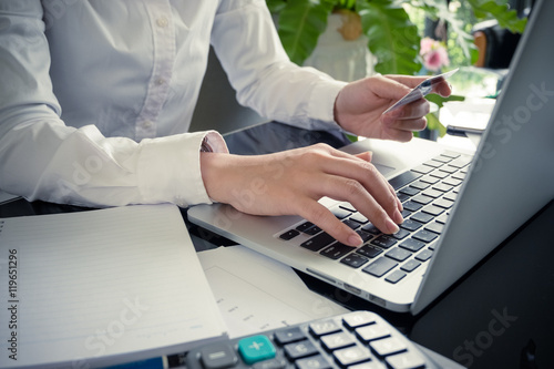Woman's hands holding a credit card and using laptop for online shopping or online payment