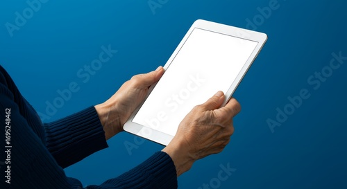 Woman's hands holding a tablet with blank screen against a vivid blue backdrop.
