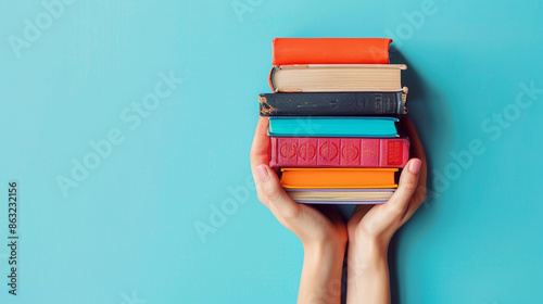 Woman's hands holding pile of books over light blue background