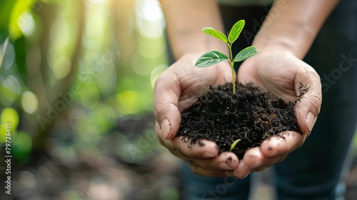 womans hands holding young plant in soil bokeh background environmental conservation concept