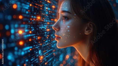 woman, digital, technology, face, profile, glowing, datum, code, future, network, artificial, intelligence, abstract, modern, science, innovation, girl, portrait, light, blue, orange, screen, pixel, matrix, fantasy, electric, energy, line, dot, pattern, aesthetic, artistic, beautiful, intriguing, intricate, stylish, futuristic, visual