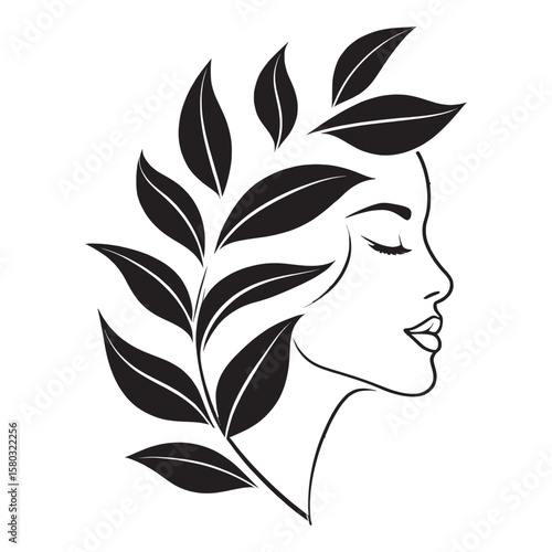 Woman's Profile with Leafy Branch - Elegant Botanical Art