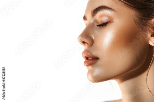 woman, face, profile, make-up, shimmery, eye, closed, lip, skin, beauty, cosmetic, model, head shot, studio, portrait, close, side, view, white, background, natural, light, feminine, shot, glowing, smooth, healthy, soft, elegant, beautiful, attractive, fashion, lifestyle, girl, portraiture, closeup, closeup, gorgeous, honed, artist, cosmetology, glamour, aesthetic, glow, routine