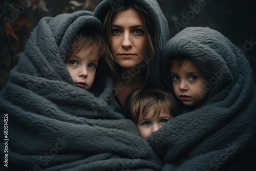 Women and children covered with blanket. Mother with kids under warm plaid. Generate ai