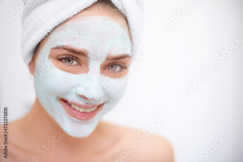 Women, face mask and skin care for portrait, bathroom and acne for organic rejuvenation. Female person, towel and smile with treatment, wellness and spa day for beauty and relaxation for hygiene