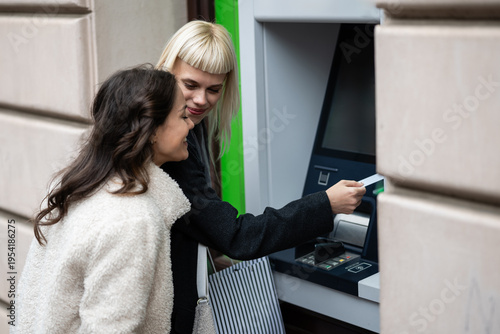 woman, friends, atm, banking, credit card, cash, withdrawal, finance, smiling, urban, city, outdoors, transaction, atm, money, payment, shopping, client, user, modern, convenient, secure, technology, bank, account, personal finance, economic, consumer, street, lifestyle, female, adult, happiness, bond, support, assisting, mutual, friendship, exchange, helping, learning, explaining, interaction, advising, guidance, security, trust, datum