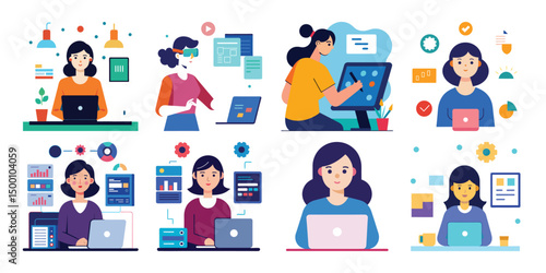 Women in Tech – Flat Vector Illustrations of Digital Work, Data Analysis, and Remote Office Scenes