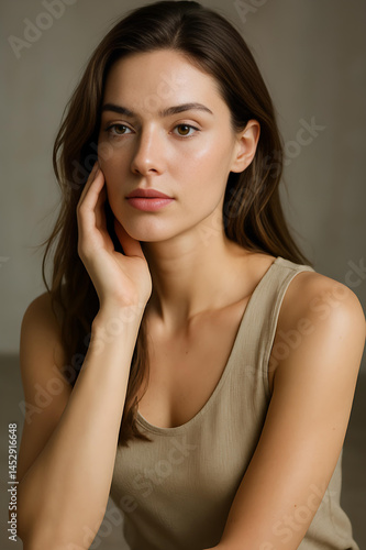 woman, beauty, face, hair, person, smile, fashion, people, model, 1, skin, closeup, hand, head, eye, look, make-up, lady, care, cephalalgia, studio, lip, smiling, stress, brunette