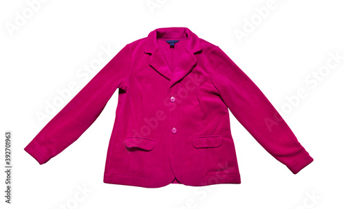 Women pink Suit Jacket closeup, pink plush jacket isolated on white background. Pink buttoned suit isolated over white