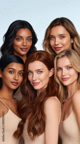 Women standing close together with different hair colors and complexions smiling warmly symbolizing diversity inclusion friendship and female solidarity
