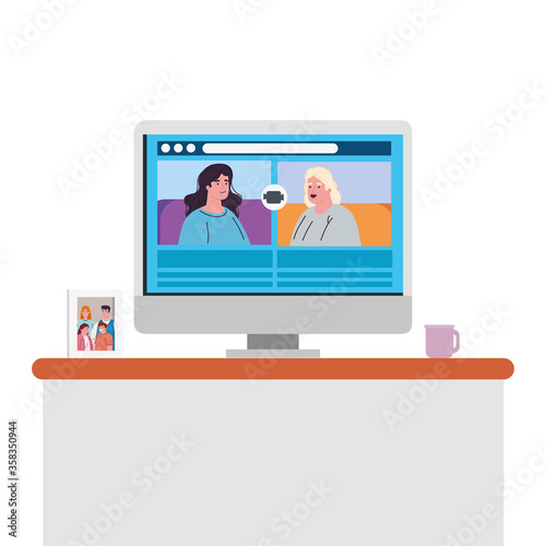 women talk to each other on the computer screen, conference video call vector illustration design