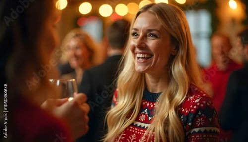 christmas party, christmas, party, joyful, celebration, holiday, woman, sweater, jumper, lively, warmth, fun, friends, happiness, gathering, winter, smile, decoration, drink, laughter, music, enjoyment, dancing, festive, community, spirit, togetherness, excitement, cosy, sharing, entertaining, atmosphere, merriment, playfulness, style, seasonal, camaraderie, tradition