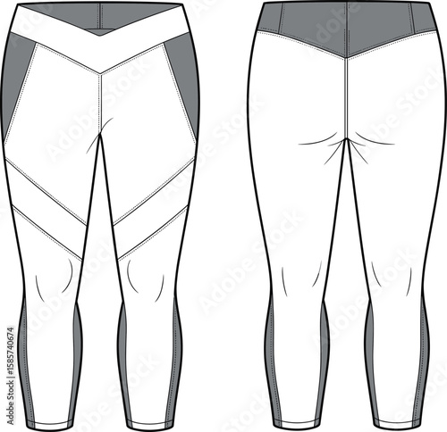 Women's activewear leggings flat sketch, front and back view, fashion technical drawing, sporty yoga pants design, fitness apparel template illustration