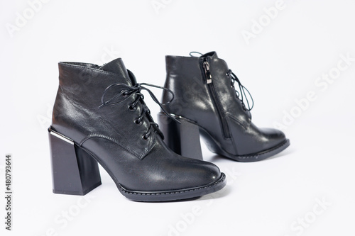 Women's boots with black genuine leather on heels isolated on a white background. photo from the side, diagonally and foreshortened from behind. Women's shoe collection 2022