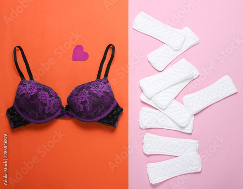 Women's critical days, menstruation. Minimalistic feminine hygiene concept. Beautiful sexy bra, panty liners on pastel background. Flat lay