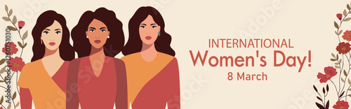 Women's Day. March 8. Women of different skin colors and cultures stand together against a backdrop of spring flowers, gender equality, women's empowerment and women's rights. For women's projects