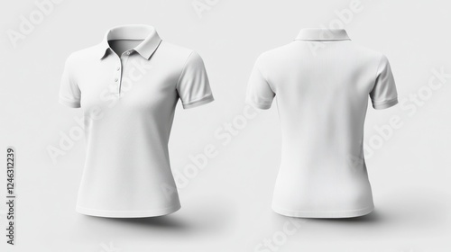 shirt, polo, apparel, clothing, fashion, white, front, back, design, style, template, casual attire, woman, female, dress, collar, sleeve, cotton, fabric, garment, product, e-business, branding, logotype, graphic, print, isolated, studio, background, simple, clean, realistic, three-dimensional, rendering, model, blank, empty