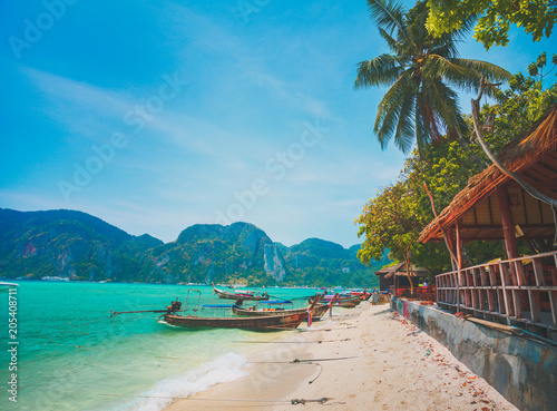 Wonderful scenery the cozy local village and the ocean shore with fishing boats on the limestone cliffs background. Idyllic place for the rest and relax. Phi Phi islands, the Kingdom of Thailand.