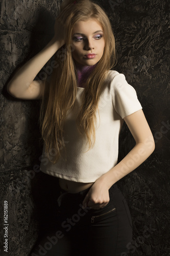 woman, apparel, model, beautiful, background, hair, glamour, fashion, young, black, portrait, long, elegant, brunette, evening, white, beauty, teenage, stylish, outfit, style, elegance, sophisticated, clothing, vogue, studio, chic, looking, attractive, caucasian, girl, make-up, coiffure, jean, t-shirt