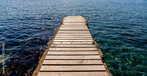 wood and concrete pier leading out into the clear refreshing waters of the Mediterranean Sea