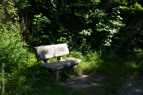 Wood bench in a small sunny clearing in a green overgrown area. Rest on a hiking trail.