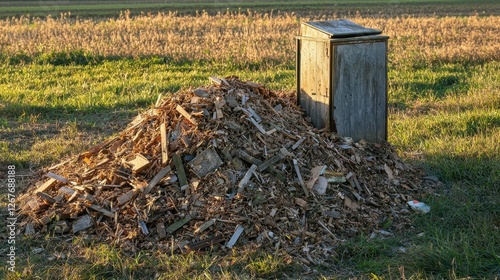 Wood Debris Pile with Old Cabinet in Field at Sunset or Sunrise