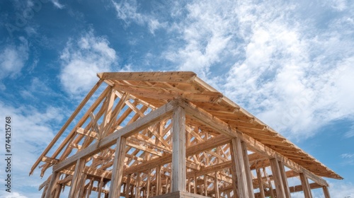 construction, new home, building, wood, architecture, real estate, sky, residential, home, development, housing, property, structure, future, investment, industry, unfinished, timbering, site, construction site, engineering, roof, wall, beam, joist, truss, wooden, framework, progress, upward, growth, mortgage, finance, project, startup, beginning, blueprint, design, renovation, improvement, concept, nobody, outdoors, bright, sunlight, erect, empty