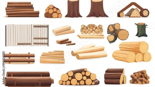 Wood industry raw material and production samples A flat set of illustrations showing tree trunks logs planks and doors representing raw materials and wood production