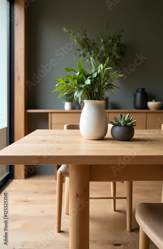 Wood Kitchen Furniture surrounded by eco-friendly materials and products, plants, minimalist design, eco-friendly approach to kitchen furnishings