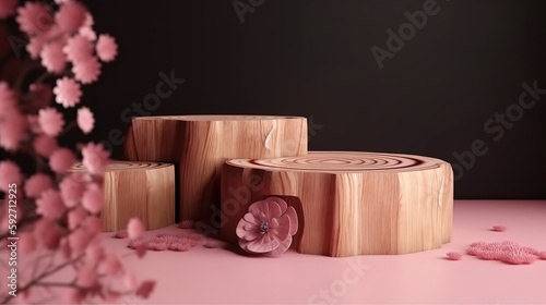 Wood Slice Podium and Pink Flowers - Concept Scene for Mother's Day, Valentine's Day, and More
