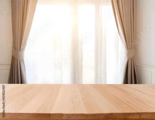 Wood table floor and Blurred background atmosphere front room light shining through the curtain in home.