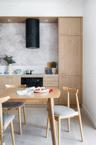 table, dining, wooden, chair, kitchen, furniture, wood, tabletop, modern, style, indoor, apartment, interior, appliance, home, cabinet, cupboard, house, design, room, background, tableware, flat, domestic, household, equipment, kitchen utensile, object, utensil, furnishing, crockery, plate, decor, decoration, induction, comfort, hob, stove, electrical, electric, oven, hood, extractor, food, cooking, concept, nobody, advertising, estate