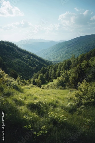 mountain, vale, forest, tree, nature, landscape, outdoors, hiking, wildlife, greenery, grass, cloudy, sky, vista, scenic, adventure, photo, hill, weather, peak, beauty, environment, flora, fauna, trail