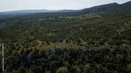 Wooded foothills with pine trees and bushes. Shot on a drone. View from above.